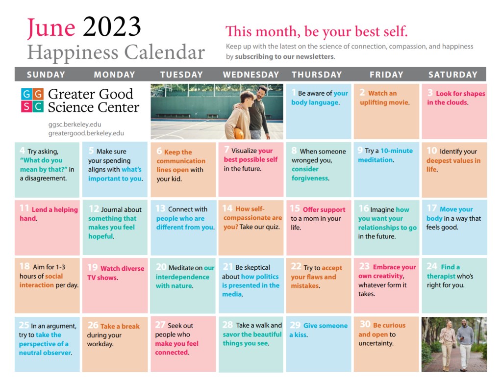Newman, K. M. (2023). Your Happiness Calendar For June 2023. This Month, Be Your Best Self. Retrieved From https://greatergood.berkeley.edu/article/item/your_happiness_calendar_for_june_2023